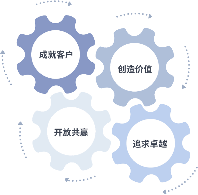 成就客户是一切决策的出发点,,创造价值是衡量所有工作的标准,,,追求卓越是我们做事做人的态度,,,开放共赢是我们的格局也是最终的结果。。价值观的齿轮环环相扣,,,推动着组织里的每个人不断向前。。。